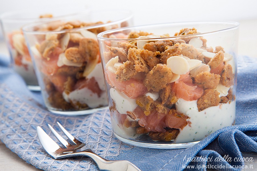 Ora siamo pronti per preparare i nostri bicchierini: sul fondo di ogni bicchiere mettete uno strato di crumble, coprite con la crema di formaggio e i cubetti di salmone, ripete la sequenza e finite con altro crumble e le mandorle a lamelle.