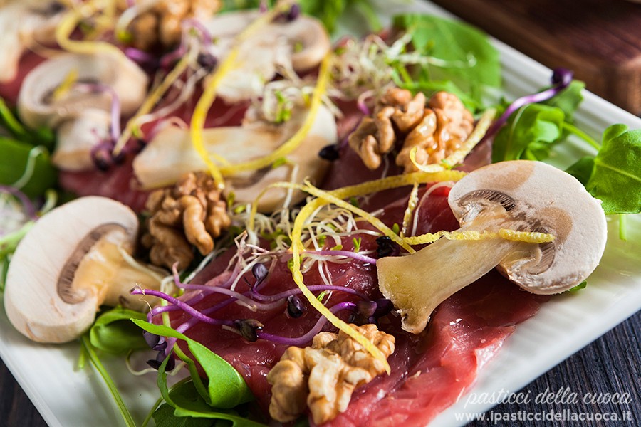 INGREDIENTI PER 2 PERSONE: 300 gr di carpaccio di vitello – 4 funghi champignon – 30 gr di noci sgusciate – rucola – germogli di barbabietole rosse – limone – sale – pepe – olio extra vergine d’oliva