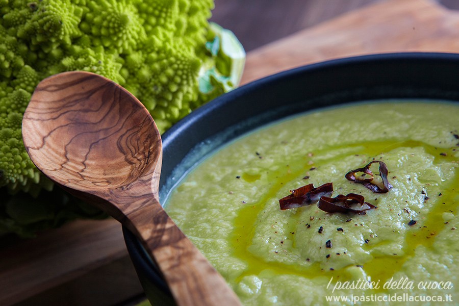 INGREDIENTI PER 2 PERSONE: 1 broccolo romano – 2 spicchi d’aglio - peperoncino essiccato – 2 cucchiai di olio extra vergine d’oliva – 250 ml di brodo vegetale